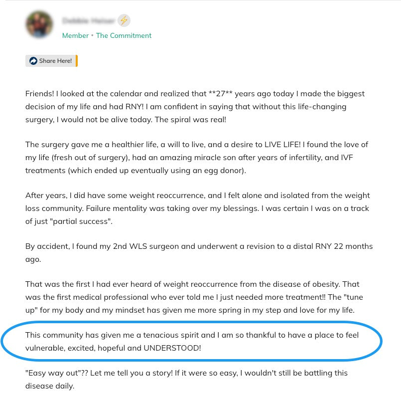 Obesity is an isolating disease that can keep us stuck. The answer to this isolation is COMMUNITY! You can participate in discussions, share ideas, and receive peer feedback as a member. This sense of belonging, connection, and social interaction will help you move through your darker days and provide the fuel you need to keep going.