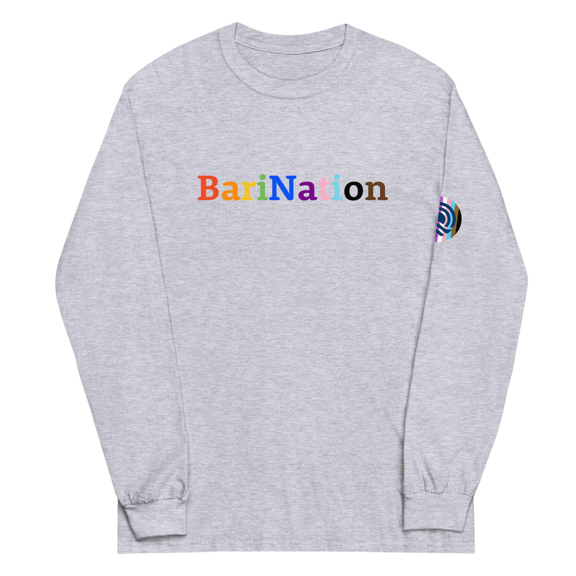 Celebrate BariNation and inclusivity with this vibrant long-sleeved tee! This t-shirt features a bold "BariNation" Text: Proudly displayed in a spectrum of colors mirroring the Pride flag. Each letter bursts with vibrant hues, showcasing your support for the LGBTQ+ community in Bari. It also has the BariNation LGBTQIA+ logo on the left sleeve.